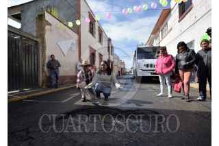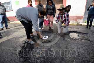 TOLUCA, ESTADO DE MÉXICO, 22AGOSTO2018.- Con mañanitas, pastel y velas, vecinos de Capultitlán, en Toluca, celebraron el tercer aniversario de los baches que se encuentran en la calle Hidalgo, a pesar de que autoridades municipales anuncian programas de bacheo, el problema de los baches continúa y la gente se encuentra molesta por esto. FOTO: ARTEMIO GUERRA BAZ /CUARTOSCURO.COM
