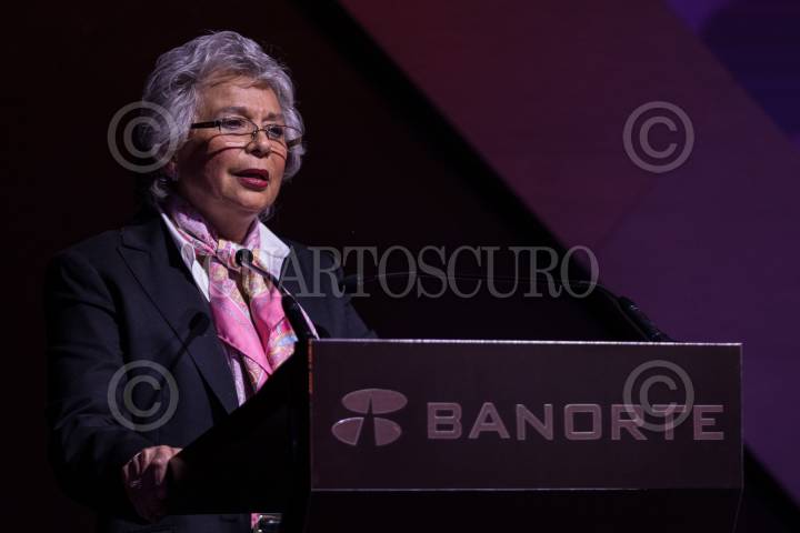 CIUDAD DE MÉXICO, 22AGOSTO2018.- Olga Sánchez Cordero, propuesta como próxima secretaria de Gobernación en el gobierno del presidente electo Andrés Manuel López Obrador, recibe un reconocimiento por parte de Carlos Hank González, Presidente de Grupo Financiero Banorte, por su participación en la conferencia: "Estado de Derecho" durante el foro Estrategia Banorte 2018. FOTO: MISAEL VALTIERRA /CUARTOSCURO.COM