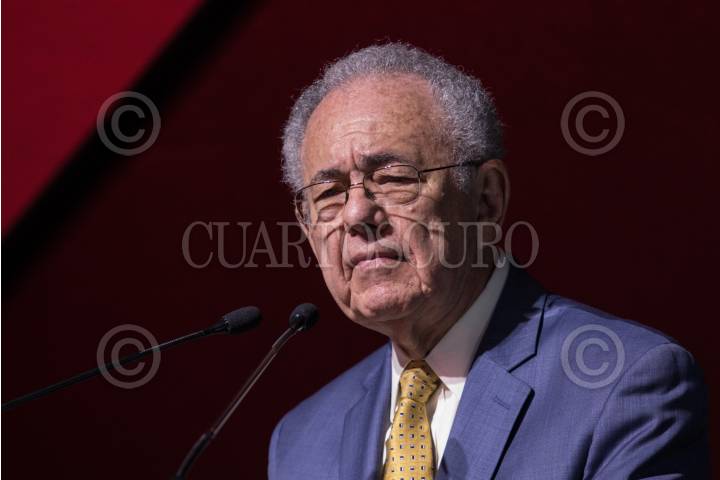 CIUDAD DE MÉXICO, 22AGOSTO2018.- Javier Jiménez Espriú, propuesto como próximo secretario de Comunicaciones y Transportes (SCT) en el gobierno del presidente electo Andrés Manuel López Obrador, recibe un reconocimiento por parte de Carlos Hank González, Presidente de Grupo Financiero Banorte, por su participación en la conferencia: "Infraestructura para el fortalecimiento de México" durante el foro Estrategia Banorte 2018. FOTO: MISAEL VALTIERRA /CUARTOSCURO.COM