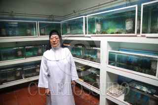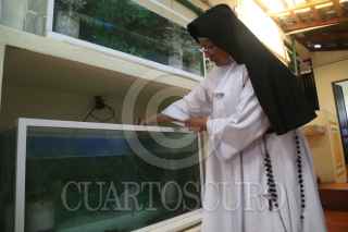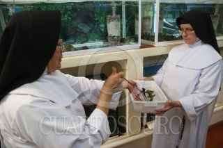 PATZCUARO, MICHOACÁN. 23AGOSTO2018. El criadero de acholote como llaman a la especie de ajolote (Amblístoma dumerilii) endémica del lago de Pátzcuaro creado en el Monasterio de María Inmaculada de la Salud por las monjas dominicas es un buen ejemplo de ello. Establecidas en Pátzcuaro desde 1747, esta orden se dedica desde hace más de 150 años a la elaboración de un jarabe de achoque contra la tos, para lo cual se surtían de este batracio en el mercado regional, donde se consumía regularmente como alimento y se empleaba en la medicina indígena. Hasta que se incrementó el problema de la eutrofización del lago al punto que el hábitat del achoque se vio severamente afectado, provocando una disminución en sus poblaciones, y en consecuencia de abastecimiento del ingrediente principal del jarabe. Se designó un equipo para que se hiciera cargo de todo aquello, algunas de sus integrantes con estudios de filosofía, y se registró en el año 2000 como una Unidad de Manejo Ambiental (UMA) ante Semarnat bajo el nombre de Jimba ni erandi, que en purépecha significa nuevo amanecer, siguiendo todos los reglamentos. El equipo tuvo que ir haciendo frente a las mil y una dificultades que se presentaban, ya que no se habían hecho criaderos para esta especie. Las condiciones de vida, las enfermedades que se presentan en cada etapa de crecimiento, el comportamiento, la reproducción, cada faceta de la vida de estos ajolotes constituía en sí misma una línea de investigación, lo cual implicaba más información y observación, mucha observación. FOTO: JUAN JOSÉ ESTRADA SERAFÍN /CUARTOSCURO.COM