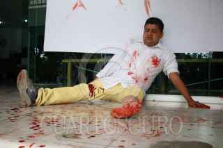 OAXACA, OAXACA, 27AGOSTO2018.- El cirujano dentista, Romulo Alberto Palacios Trejo trabajador de la Secretaría de Salud del estado se desangró este lunes frente a las oficinas de la dirección de Recursos Humanos de esa dependencia, lo anterior debido a que se han negado a brindarle la seguridad social pese a que firmaron dicho compromiso, esto derivado de que sufrió un accidente de trabajo lo que ocasionó perdiera dos dedos el pie izquierdo. Además acusó está siendo hostigado para que renuncie a su puesto en la clínica de salud del municipio de San Antonio de la Cal en donde ya se le impide el acceso por parte de policías municipales. FOTO: ARTURO PÉREZ ALFONSO/ CUARTOSCURO.COM