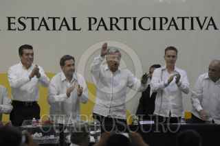 TUXTLA GUTIÉRREZ, CHIAPAS, 27AGOSTO2018.- Andrés Manuel López Obrador, Presidente Electo de México, encabezó la puesta en marcha del Foro de Consulta Estatal Participativa en Chiapas. A la cita también asistieron Estebán Moctezuma, designado como el futuro secretario de Educación Pública, y Manuel Velasco, gobernador de la entidad. FOTO. JACOB GARCÍA / CUARTOSCURO.COM