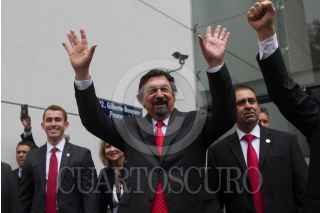 CIUDAD DE MÉXICO, 29AGOSTO2018.- El líder minero Napoleón Gómez Urrutia y su esposa Oralia Casso festejaron junto con mineros canadienses y mexicanos tras la toma de protesta de "Napo" como senador de Morena en la Cámara de Senadores para la 64 Legislatura. FOTO: MOISÉS PABLO /CUARTOSCURO.COM