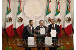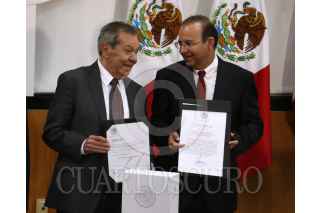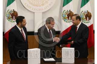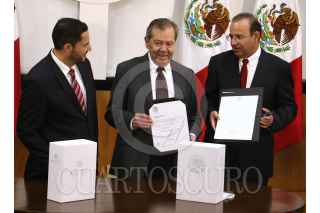 CIUDAD DE MÉXICO, 01SSEPTIEMBRE2018.- Alfonso Navarrete Prida, Secretario de Gobernación, entregó los libros del Sexto Informe de Gobierno del presidente Enrique Peña Nieto a Porfirio Muñoz Ledo, presidente de de la Cámara de Diputados, durante la entrega lo acompaño Martí Batres Guadarrama, presidente de la mesa directiva del Senado de la Republica. FOTO: SAÚL LÓPEZ/ CUARTOSCURO.COM