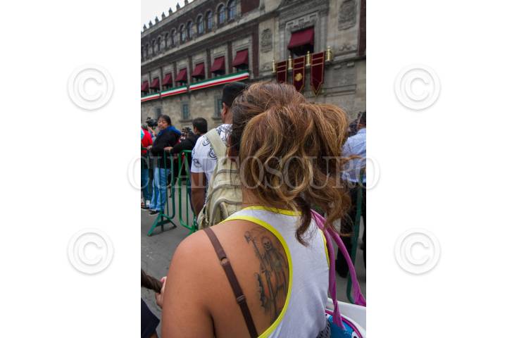 CIUDAD DE MÉXICO, 03SEPTIEMBRE2018.- Una mujer con una tatuaje de la Santa Muerte en la espalda mira el balcón presidencial del Palacio Nacional, lugar en donde hoy se realizó el 6to Informe de Gobierno del Presidente de México, Enrique Peña Nieto, diversas ONG y organizaciones sociales calculan en más de cien mil homicidios dolosos, muchos ligados a la lucha contra el crimen organizado. FOTO: MOISÉS PABLO /CUARTOSCURO.COM