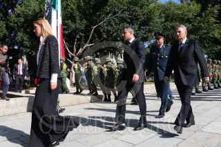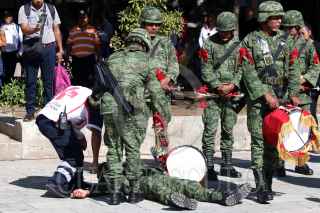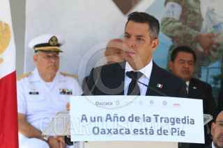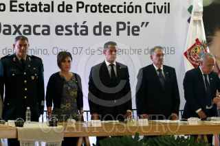 OAXACA, OAXACA, 07SEPTIEMBRE2018.- A un año del sismo del 7 de septiembre y que devastó 41 municipios oaxaqueños, principalmente en la región del Istmo de Tehuantepec, se realizó un acto solemne en la capital del estado que fue encabezado por el gobernador, Alejandro Murat, la titular de la Sedatu, Rosario Robles y Luis Felipe Puente coordinador Nacional de Protección Civil, durante dicho acto un soldado de la Octava Región Militar se desmayó. Posteriormente se realizó una sesión del Consejo Estatal de Protección Civil y finalmente una conferencia de prensa donde hablaron de los avances en la reconstrucción, de acuerdo con sus datos el 80 por ciento de viviendas dañadas ya presentan algún avance. FOTO: ARTURO PÉREZ ALFONSO/ CUARTOSCURO.COM