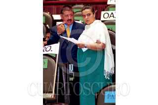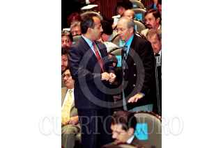 Los legisladores panistas Felipe Calderon y Luis Pazos conversan durante el analisis del VI Informe de gobierno del presidente Zedillo en la sesión de la Cámara baja. FOTO: Pedro Mera/CUARTOSCURO.COM