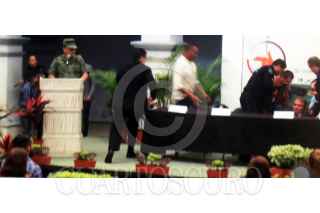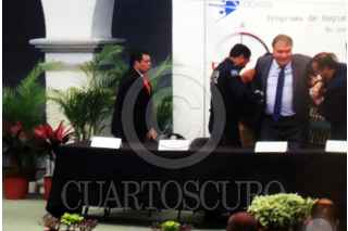 CUERNAVACA, MORELOS, 10SEPTIEMBRE2018.- José Manuel Sanz, coordinador de enlace del gobierno electo, se cayó junto con la silla que ocupaba en el estrado del evento de registro y canje de armas. Fotogramas de un video tomado con un celular. FOTO: ESPECIAL /CUARTOSCURO.COM