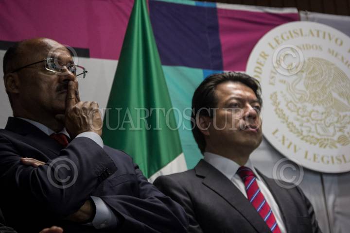 CIUDAD DE MÉXICO, 11SEPTIEMBRE2018.- Juan Carlos Romero Hicks, coordinador de los panistas, Mario Delgado, coordinador morenista, y René Juárez Cisneros, coordinador de los priistas, todos en Cámara de Diputados. Durante la conferencia de prensa para anunciar el acuerdo de recorte a los gastos en la presente Legislatura. FOTO: GALO CAÑAS /CUARTOSCURO.COM