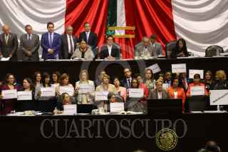 CIUDAD DE MÉXICO 11SEPTIEMBRE2018.- Durante la intervención en tribuna de la diputada de Morena, Lorena Cuéllar Cisneros, en la sesión de la Cámara de Diputados, mujeres de este grupo parlamentario se subieron a la tribuna para exhortar a los gobiernos estatales, INE, organismos públicos locales y Tribunal Electoral del Poder Judicial de la Federación, a garantizar los derechos y prerrogativas políticos-electorales de las mujeres. FOTO: GALO CAÑAS /CUARTOSCURO.COM