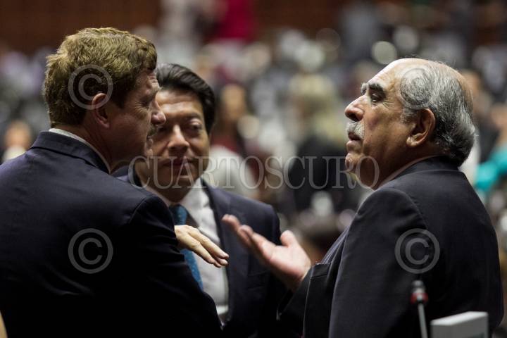 CIUDAD DE MÉXICO, 13SEPTIEMBRE2018.- René Juárez Cisneros, coordinador de la bancada priista, y Juan Carlos Romero Hicks, coordinador panista, durante la sexta sesión ordinaria de la LXIV legislatura en la Cámara Baja. FOTO: GALO CAÑAS /CUARTOSCURO.COM