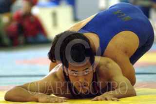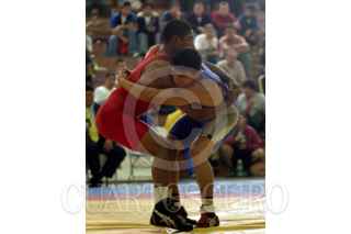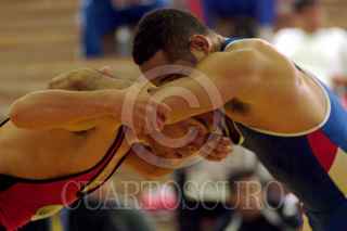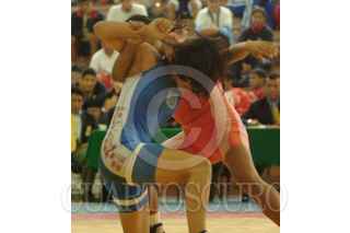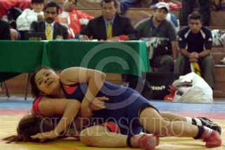 La peruana Jobita Chacón se impusó a la mexicana Pamela Buendía, durante el Festival Olimpico Mexicano de Lucha, que se llevó a cabo en el CDOM. FOTO: Nelly Salas/CUARTOSCURO.COM