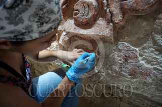 CAMPECHE, CAMPECHE, 17SEPTIEMBRE2018.- El Instituto Nacional de Antropología e Historia (INAH) realiza acciones de conservación en los frisos policromados de Balamkú y Becán. Las intervenciones se realizan anualmente como parte del proyecto de Conservación Emergente de Sitios Arqueológicos de Campeche. FOTO: ESPECIAL / CENTRO INAH CAMPECHE / CUARTOSCURO.COM
