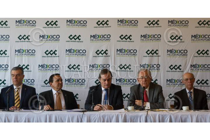 CIUDAD DE MÉXICO, 18SEPTIEMBRE2018.- Los integrantes del Consejo Coordinador Empresarial encabezados por su presidente, Juan Pablo Castañón, entrego al próximo Secretario de Transportes, Javier Jiménez Espriú, un diagnóstico técnico y financiero por el cual ellos recomiendan se continué con la construcción del Nuevo Aeropuerto Internacional de la Ciudad (NAIC) en Texcoco. En la imagen Jiménez Espríu conversa con Bosco de la Vega, presidente del Consejo Nacional Agropecuario, y José Méndez Fabre, presidente de la AMIB. FOTO: MOISÉS PABLO /CUARTOSCURO.COM