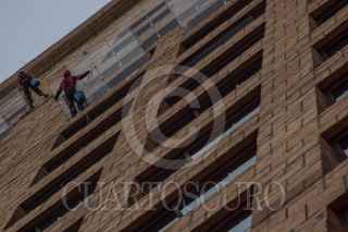 CIUDAD DE MÉXICO, 19SEPTIEMBRE2018.- Limpiadores realizan su peligrosa labor sobre el edificio del Palacio de Hierro en la colonia Polanco. FOTO: GALO CAÑAS /CUARTOSCURO.COM
