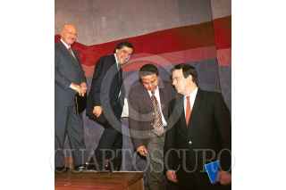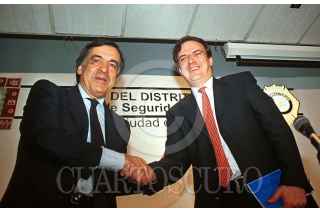 Leoluca Orlando, exalcalde de Palermo, y Marcelo Ebrard títular de la secretaria de Seguridad Pública del D.F al término de la firma convenio de plan de seguridad, en donde la primera etapa se creará una cultura de la legalidad que será impartida en los planteles educativos de la capital del país. FOTO: Eunice Adorno/CUARTOSCURO.COM