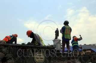 CUERNAVACA, MORELOS, 19SEPTIEMBRE2018.- Albañiles bajo la tutela de especialistas del Instituto Nacional de Antropología e Historia, trabajan en la reconstrucción del Palacio de Cortes, a un año del sismo que lo afecto, al fondo la estatua de Carlos Pacheco, gobernador porfirista de Morelos. FOTO: MARGARITO PÉREZ RETANA /CUARTOSCURO.COM