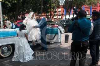 CIUDAD DE MÉXICO, 21SEPTIEMBRE2018.- Una novia baja del automóvil clásico que la trasladó al centro de Coyoacán para su boda. A un lado se encuentra el fotógrafo que registra los hechos. FOTO: DIEGO SIMÓN SÁNCHEZ /CUARTOSCURO.COM