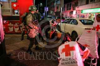 ACAPULCO, GUERRERO, Un guardia de seguridad resultó herido ayer a la media noche luego de que hombres armados a bordo de un taxi atacaran a balazos el bar Lips, ubicado en la avenida costera de Acapulco, soldados y policías turísticos llegaron a resguardar la zona mientras que paramédicos de la Cruz Roja trasladaron al herido a un hospital. FOTO: CARLOS ALBERTO CARBAJAL /CUARTOSCURO.COM