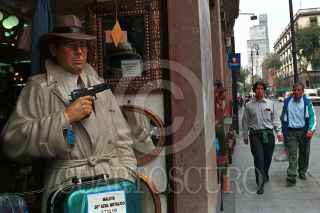 Un maniquí vestido de agente secreto, es expuesto al público, en una tienda ubicada en el centro histórico.