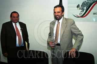 Fernando Matán, director general de comercialización del Fondo Nacional de Empresas Sociales Exitosas y Gerardo Aranda Orozco, titular del FONAES, ofrecieron una conferencia de prensa en las instalaciones de la Secretaria de Economía. FOTO: Moisés Pablo/CUARTOSCURO.COM