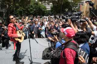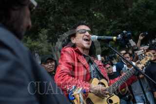 CIUDAD DE MÉXICO, 01OCTUBRE2018.- Alex Lora, líder de la banda de rock mexicano, El Tri, ofreció un palomazo durante la develación del mural "EL Tri: 50 años de rock en México" el cual se encuentra a un costado de la plaza Tlaxcoaque en el centro de la Ciudad de México. FOTO: MISAEL VALTIERRA / CUARTOSCURO.COM