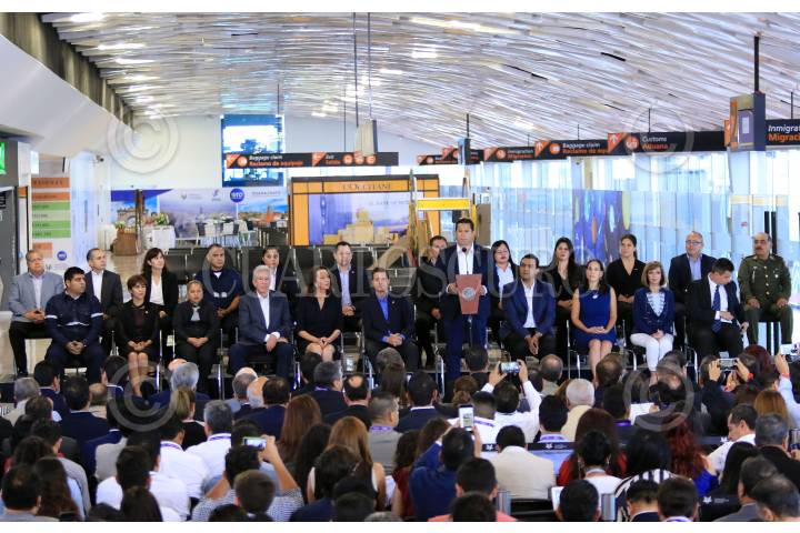 GUANAJUATO, GUANAJUATO, 02OCTUBRE2018.- Enrique Peña Nieto, Presidente de México; Diego Sinhue RodrÍguez Vallejo, gobernador del estado, y Laura Díez Barroso Azcárraga, presidenta del consejo de Administración de GAP, durante la inauguración de la ampliación y modernización del Aeropuerto Internacional de Guanajuato. FOTO: GUSTAVO BECERRA /CUARTOSCURO.COM