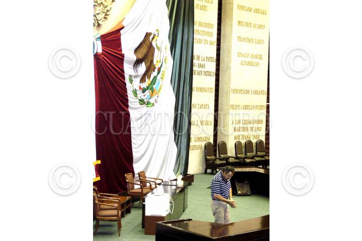 Trabajadores de la Cámara de Diputados realizan labores de remodelación en el salón de sesiones a dos semanas que se inicien los trabajos legislativos. FOTO: Germán Romero/CUARTOSCURO.COM