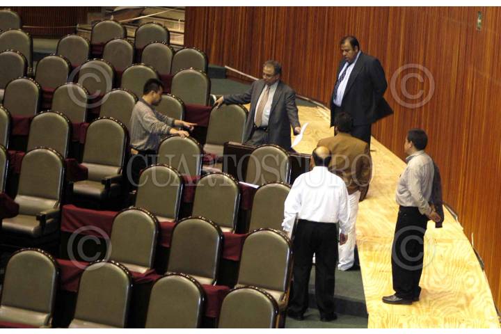 Trabajadores de la Cámara de Diputados realizan labores de remodelación en el salón de sesiones a dos semanas que se inicien los trabajos legislativos. FOTO: Germán Romero/CUARTOSCURO.COM