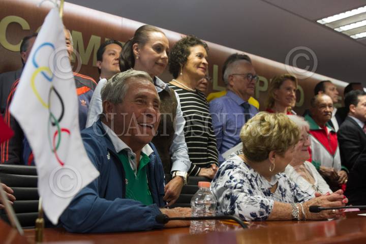 CIUDAD DE MÉXICO. 03OCTUBRE2018.- Agustín Zaragoza, y Joaquín Rocha, ambos boxeadores medallistas de bronce en los Juegos Olímpicos de 1968, durante la presentación del documental "Los Juegos Olímpicos de México 68 Memorias Imborrables", el cual es producido por Alejandro Reyes y será transmitido por Canal 14, del 12 al 27 de octubre, realizada en las instalaciones del Comité Olímpico Mexicano (COM). FOTO: MOISÉS PABLO /CUARTOSCURO.COM