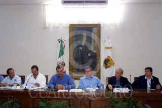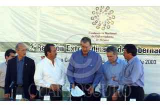 , El Gobernador de Nuevo Leon Fernando Elizondo, Enrique Martinez de Coahuila, el presidente Vicente Fox y el secretario de Gobernacion Santiago Creel y Ricardo Monreal de Zacatecas durante la conferencia de prensa al termino de la segunda reunion extraordinaria. FOTO: Juan Sotelo/CUARTOSCURO.COM