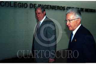 Raúl Muñoz Leos, director de PEMEX, es acompañado por Manuel Gómez Rangel, en el colegio de Ingenieros Civiles de México. Donde se realizó el IV foro ¨Pemex: Inversiones para impulsar el crecimiento¨. FOTO: Moisés Pablo/CUARTOSCURO.COM