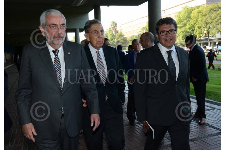 CIUDAD DE MÉXICO, 08OCTUBRE2018.- Mónica González Contró, abogada general de la Universidad; Cuauhtémoc Cárdenas, presidente de la Fundación para la Democracia, Alternativa y Debate; Enrique Graue, rector de la UNAM; Raúl Contreras Bustamante, director de la Facultad de Derecho, y Ricardo Monreal, coordinador de Morena en el Senado de la República, durante la inauguración del Primer Congreso Internacional de Derecho Penal. El rector de la Máxima Casa de Estudios señaló que la corrupción en México equivale hasta 10 por ciento de 21.9 millones de millones de pesos anuales, cifra total del Producto Interno Bruto (PIB) de 2017. FOTO: UNAM /CUARTOSCURO.COM