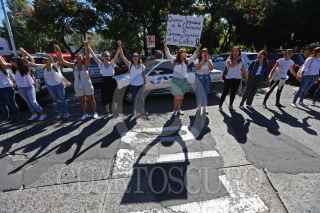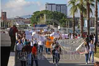 GUADALAJARA, JALISCO, 09OCTUBRE2018.- Cientos de Alumnos del Centro Universitario de Ciencias Sociales y Humanidades (CUCSH) de la Universidad de Guadalajara, se manifestaron y marcharon de su centro universitario hasta las Secretaria de Movilidad para protestar por la inseguridad que sufren los estudiantes, ya que el día de ayer una joven fue atropellada por una unidad de Transporte Publico la cual falleció y otra mas perdió la vida en un intento de asalto. FOTO: FERNANDO CARRANZA GARCIA/CUARTOSCURO.COM
