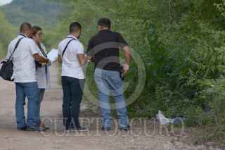 CULIACÁN, SINALOA, 11OCTUBRE2018.- Junto a un mensaje donde los señalan de ser secuestradores, dos jóvenes aparecieron ejecutados y encintados, a la orilla de un camino vecinal de la sindicatura de Tepuche, al norte de esta ciudad. Las corporaciones policiacas informaron que las víctimas tienen entre 25 a 30 años, y estatura mediana. Uno de ellos es delgado, de tez morena, con barba y bigote, y vestía un pantalón de mezclilla azul y playera tipo polo azul marino y calcetas blancas. La otra víctima es de tez blanca, ojos claros, complexión gruesa, la cual vestía pantalón de mezclilla negro, y playera polo azul marino. El hallazgo fue reportado por vecinos a las corporaciones policiacas alrededor de las 18:00 horas. El reporte indicó que a la orilla del camino que va del poblado La Pitayita a Aguas Blancas, en Tepuche, se hallaban los cadáveres de dos personas. Los cuerpos de las víctimas estaban tendidos uno al lado del otro, tenían las manos y los pies encintados, y presentaban heridas de bala y de golpes en la cabeza. Junto a los jóvenes asesinados peritos localizaron un mensaje escrito en una cartulina amarilla que decía: “Esto les pasa por andar secuestrando, hijos de su puta madre”. Los cadáveres fueron trasladados al Servicio Médico Forense en espera de que sean identificados. FOTO: JUAN CARLOS CRUZ /CUARTOSCURO.COM