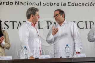 COLIMA, COLIMA, 11OCTUBRE2018.- Esteban Moctezuma Barragán, quien será el futuro secretario de la Educación, y José Ignacio Peralta, gobernador de la entidad, encabezaron la Consulta Estatal participativa por un acuerdo Nacional de la Educación, que reúne a académicos, estudiantes, y padres de familia, para analizar mejores formas de elevar la educación en México. FOTO: ANDRÉS YAÑEZ /CUARTOSCURO.COM