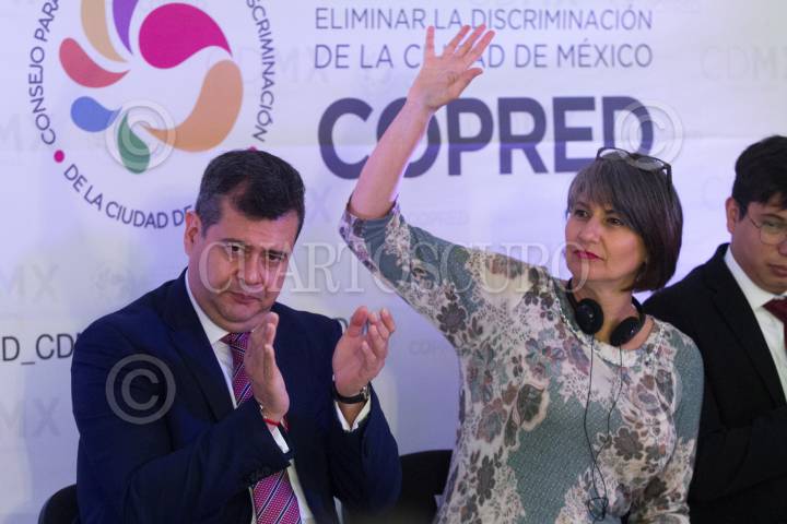 CIUDAD DE MÉXICO, 11OCTUBRE2018.- Almudena Ocejo Rojo, quien estará al frente de la Secretaría de Desarrollo Social de la Ciudad de México; Margarette May Macaulay, comisionada de la Comisión Interamericana de Derechos Humanos (CIDH) y Relatora sobre los Derechos de las Personas Afrodescendientes y contra la Discriminación Racial; José Ramón Amieva. Jefe de Gobierno, y Jaqueline L'Hoist Tapia, presidenta del Consejo para Prevenir y Eliminar la Discriminación de la Ciudad de México (COPRED), al finalizar la primera actividad que realizó la integrante de la CIDH en México, como parte de una gira de trabajo, el encuentro se realizó en la sede de la Copred. FOTO: MOISÉS PABLO /CUARTOSCURO.COM