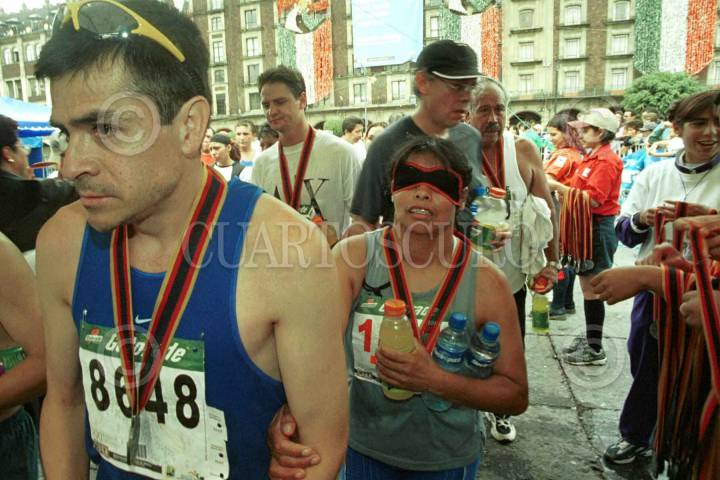 Este sujeto que se hace llamar el Juan Diego maratonista, fue uno de los últimos en terminar el recorrido. Sin embargo dijo que eso no le preocupaba, ya que el corría por la paz mundial. FOTO: Moisés Pablo/CUARTOSCURO.COM