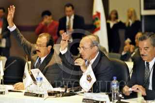 Ricardo Monreal Avila, gobernador de Zacatecas se despide de Andres Manuel Lopez Obrador, gobernador del DF al terminar la reunion de la Conago en Cintermex. Al fondo José Murat gobernador de Oaxaca. FOTO PEDRO VALTIERRA/CUARTOSCURO.COM