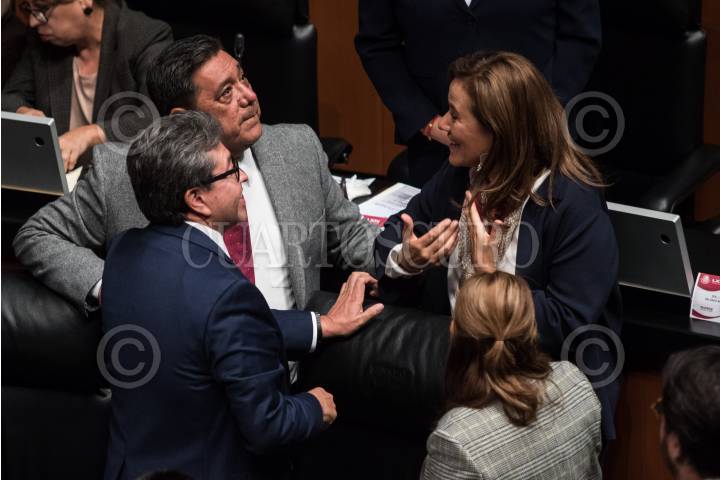 CIUDAD DE MÉXICO, 16OCTUBRE2018.- Miguel Ángel Osorio Chong, coordinador de los senadores del PRI y Gustavo Madero, senador del PAN, conversan durante la sesión solenme por los 65 años del derecho al voto de la mujer en México. FOTO: MISAEL VALTIERRA /CUARTOSCURO.COM