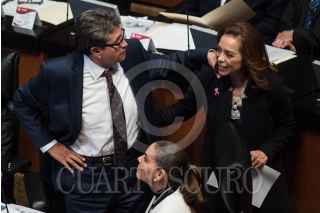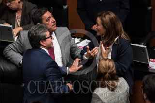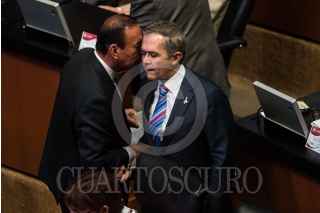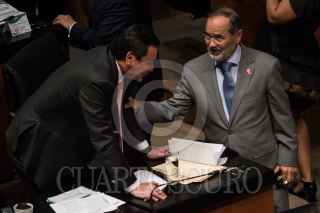 CIUDAD DE MÉXICO, 16OCTUBRE2018.- Miguel Ángel Osorio Chong, coordinador de los senadores del PRI y Gustavo Madero, senador del PAN, conversan durante la sesión solenme por los 65 años del derecho al voto de la mujer en México. FOTO: MISAEL VALTIERRA /CUARTOSCURO.COM