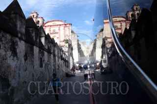 CUERNAVACA, MORELOS, 18OCTUBRE2018.- Reflejo del templo de San Francisco Tercera Orden en un autobús de turismo que espera en la calle. FOTO: MARGARITO PÉREZ RETANA/ CUARTOSCURO.COM