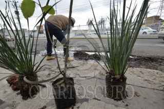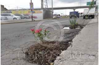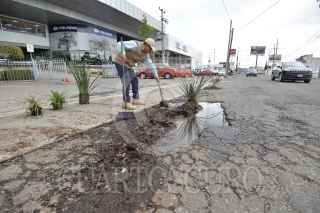 TOLUCA, ESTADO DE MÉXICO, 18OCTUBRE2018.- Comercios instalados en la avenida Diaz Mirón casi esquina con Las Torres colocaron plantas y árboles frutales en los baches qué hay en este lugar, ante la poca respuesta de las autoridades para resolver el problema de baches. FOTO: ARTEMIO GUERRA BAZ /CUARTOSCURO.COM