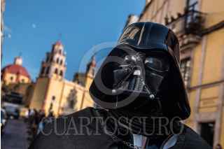 GUANAJUATO, GUANAJUATO, 18OCTUBRE2018.- Una persona caracterizada de Darth Vader, personaje de la famosa película Star Wars, se mantiene presente en la plaza de la Paz, ubicada en el centro de la ciudad, en busca de ganar algunas monedas al ser retratado por turistas. FOTO: MARIO JASSO /CUARTOSCURO.COM