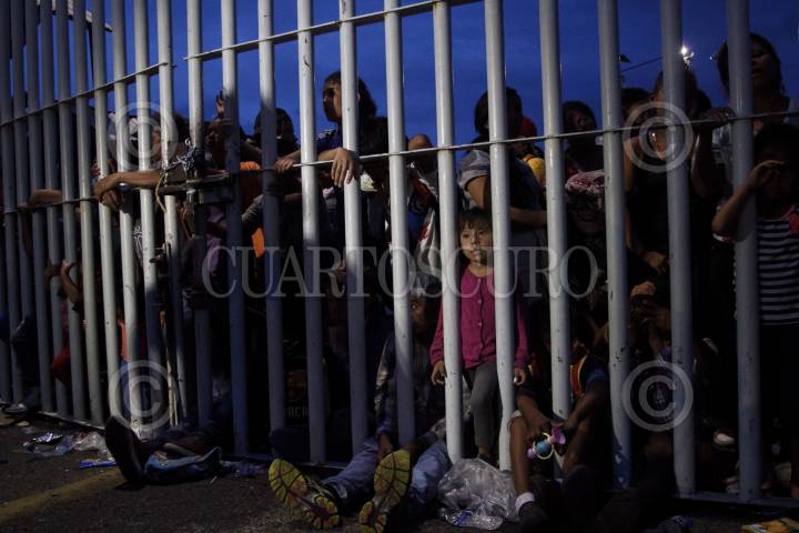 SUCHIATE, CHIAPAS, 20OCTUBRE2018.- En el paso fronterizo de Guatemala-México, miles de migrantes esperan a pasar al lado mexicano, en su caravana hacia Estados Unidos. Autoridades mexicanas prometieron trasladarlos de forma ordenada a albergues luego de que los hondureños, en su mayoría, intentaron pasar y se suscitaron disturbios; sin embargo, el traslado se ha vuelto lento. FOTO: ISAAC ESQUIVEL /CUARTOSCURO.COM