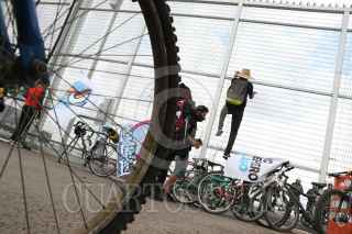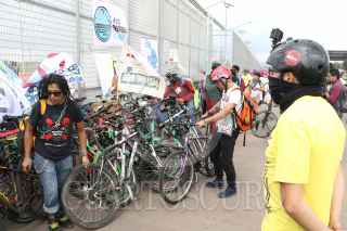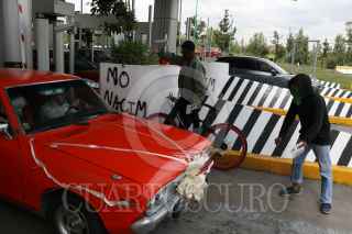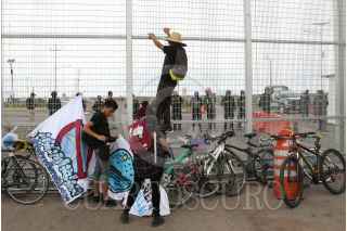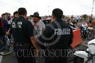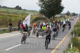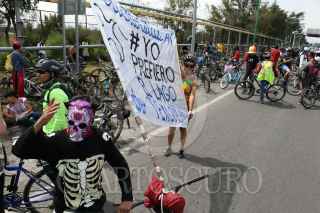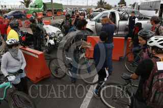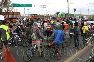 TEXCOCO, ESTADO DE MÉXICO, 20OCTUBRE2018.- Decenas de jóvenes en bicicletas participaron en la rodada "Bicis Vs Aviones" que partio del monumento a la revolución hacia la puerta 7 del nuevo aeropuerto Internacional de la Ciudad de México. Los inconformes tomaron por algunos minutos la caseta Peñon-Texcoco y bloquearon la autopista para exigir que paren las obras debido a que es un ecocidio que provocaría la extinción del lago de Texcoco. FOTO: SAÚL LÓPEZ /CUARTOSCURO.COM