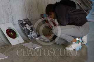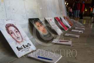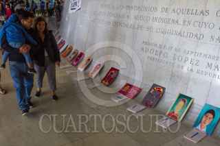 CIUDAD DE MÉXICO, 21OCTUBRE2018.- En la entrada del Museo Nacional de Antropología estudiantes de la Escuela Nacional de Antropología e Historia (ENAH) colocaron un altar para recordar a los 43 jóvenes desaparecidos de la escuela rural "Raúl Isidro Burgos", con retratos de los jóvenes originarios de Ayotzinapa, Guerrero, se invita a la gente a que escriba una frase de aliento para sus familias en libretas colocadas exprofeso para ello. FOTO: MOISÉS PABLO /CUARTOSCURO.COM