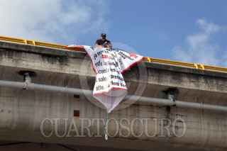 ACAPULCO, GUERRERO, 21OCTUBRE2018.- Policías ministeriales retiran una manta del crime organizado que fue colocada por hombres armados que realizaron disparos al aire en el puente Bicentenario de la avenida Cuauhtémoc. FOTO: CARLOS ALBERTO CARBAJAL /CUARTOSCURO.COM