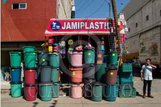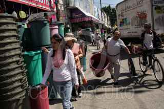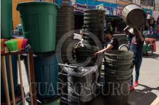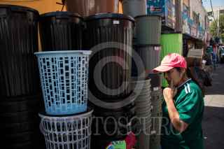 CIUDAD DE MÉXICO, 24OCTUBRE2018.- Habitantes de la ciudad visitan la zona comercial en los alrededores del mercado de la Merced para adquirir botes, tinacos y recipientes para el almacenamiento de agua debido al mega corte del vital líquido que hará la Comisión Nacional del Agua (Conagua) por el mantenimiento al Sistema Cutzamala. Los precios de los recipientes de hasta 120 litros oscilan entre los 300 y 500 pesos. FOTO: MISAEL VALTIERRA /CUARTOSCURO.COM