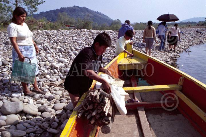 PANTEPEC, PUEBLA01ENE2004.-Luego de cruzar a las personas, el pequeño lanchero se da un chapuzón en el Pantepec. Los cauces de este alimentan los cultivos de cafe, maíz, frijol y diversos arboles frutales, tamarindo y naranja entre otros. FOTO: Juan Pablo Zamora/CUARTOSCURO.COM